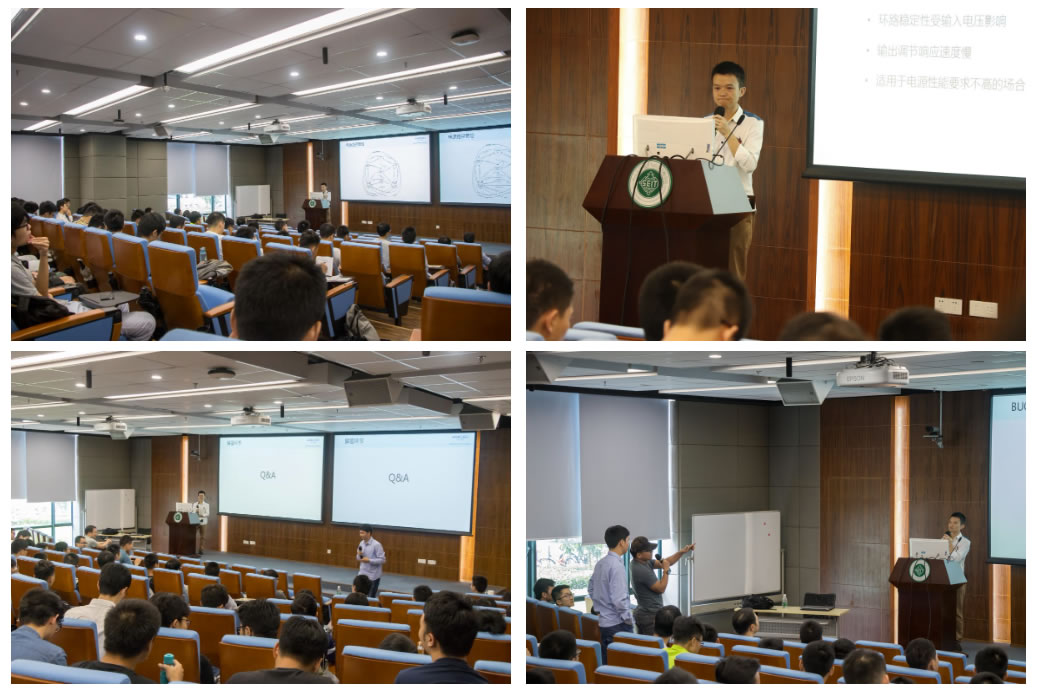 赵伟兵总监首先介绍了高压电源管理IC在汽车电子、无人机、扫地机器人等领域的应用场景和发展前景。针对珠海一微自研的扫地机器人芯片的应用实例,介绍了一款集成了充电管理、多路降压型DC-DC及线性LDO稳压器等的电源管理芯片。并就其中的设计要点如电源路径管理策略、环路建模及稳定性分析、一致性设计、噪声考虑等进行了重点讲解。除此以外,还与在座师生分享了一些工程设计中的细节问题,如版图的寄生效应等。最后,主讲嘉宾分享了自己研究生毕业后的从业经历,鼓励在座的年轻学子们勇于探索、潜心科研,在国家重视和扶持集成电路产业发展的新形势下、在集成电路产业蓬勃发展的浪潮中闯出一片属于自己的天地。嘉宾的精彩演讲赢得了全场师生热烈的掌声。