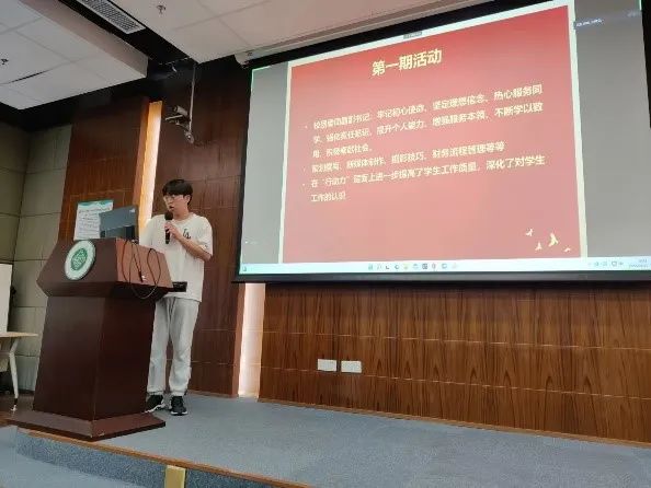在观看校友分享视频之后是小组分享环节,三位团学骨干代表向大家展示参加本学期第一届三力训练营的心得体会。林逸凡同学回顾了他在往期活动中“学习力、思想力、行动力“三方面的感悟,包括工作技能学习、马克思主义基础理论学习、学业生涯规划等内容。吴婷晖、夏锑锑两位同学回顾了往期活动的主要内容,并分享了如何将“三力”提升运用到班团工作开展中,更好地提升自我,服务同学。
