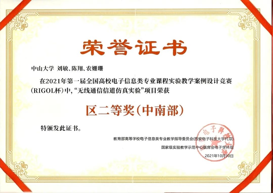 2021年10月30日,威廉希尔中文网站平台实验教学中心刘敏老师牵头、陈翔与农姗珊两位老师参与组建的教学团队,在第一届全国高校电子信息类专业课程实验教学案例设计竞赛中荣获中南赛区二等奖。