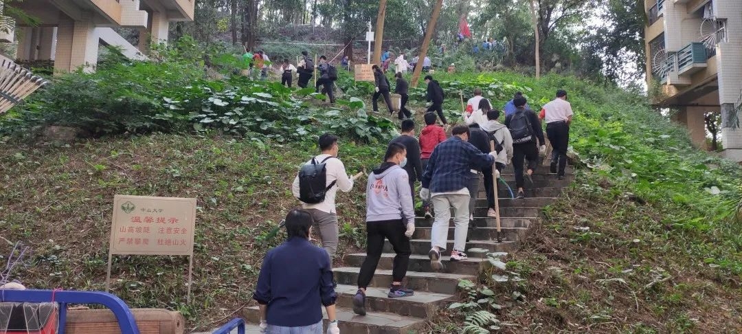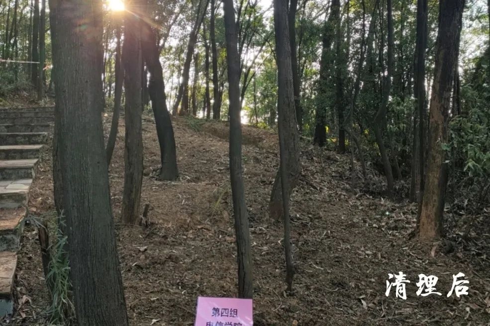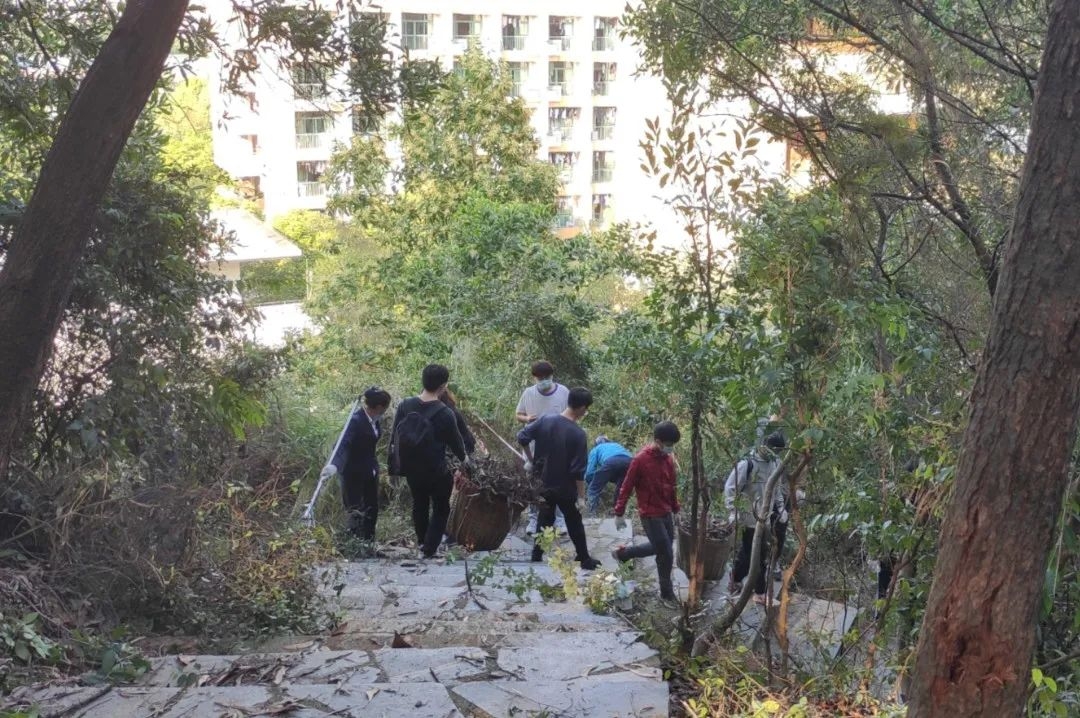 本次活动主要工作为清理东校园明德园冕山枯枝杂草并搬运下山,根据保卫办安排,硕士光电A班第二党支部同志与保卫处两位老师、部分中航物业人员共同负责第四组清理区域。