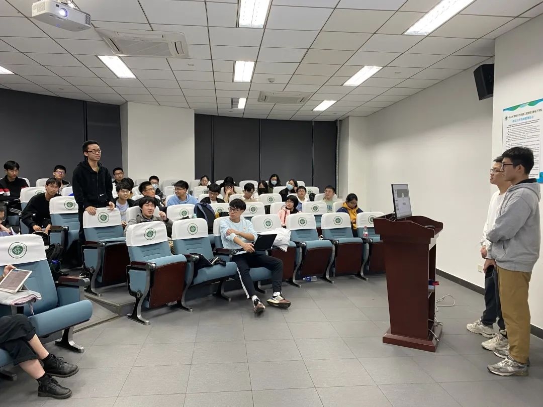 最后由牟炳叡同志和周燕贤同志进行学科竞赛的介绍。牟炳叡同志本科专业是电子信息科学与技术专业,获得过全国电子设计竞赛国家二等奖、全国大学生机器人大赛南部赛区三等奖等奖项。牟炳叡同志针对电设竞赛进行基本情况的介绍、赛题分析、如何组建队伍、如何获取资源等问题展开讲解。期间强调与他人组队时需要保持团结,不断从失败中前进,才能收获成功,以及坚持友谊第一的原则。周燕贤同志本科专业为微电子科学与技术,曾获得全国大学生集成电路创新创业大赛全国一等奖、中山大学2021届优秀本科毕业生等荣誉。周燕贤针对全国大学生集成电路创新创业大赛进行介绍,包含大赛特点、规模、日程安排、赛事内容,以及个人比赛经验进行讲解。强调学习比比赛要重要,要学有余力、量力而行,不要为了比赛落下学习,切实把专业基础打牢。