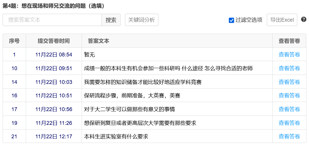 活动正式开始前,支部同志们以问卷形式进行了初步调研。问卷收集了同学们感兴趣的话题及目前对自己学业发展的疑虑。支部各位同志利用课余时间分析了问卷结果,从而更有针对性地设计自己分享的内容。