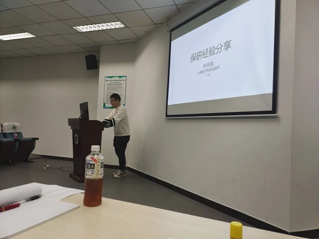 首先进行分享的是孙天成同志,他以专业名次第八的优秀成绩保研本院电子科学与技术专业。孙天成同志针对为什么要读研、保研条件、保研流程、保研注意事项、专业选择、导师选择等问题进行解答。在分享过程中,孙天成同志建议保研的同学在正式开启研究生生活前的半年时间里,一定不要虚度,可以提前进入实验室适应研究生生活,同时,也可以学习更多新的知识,不断充实提升自己。