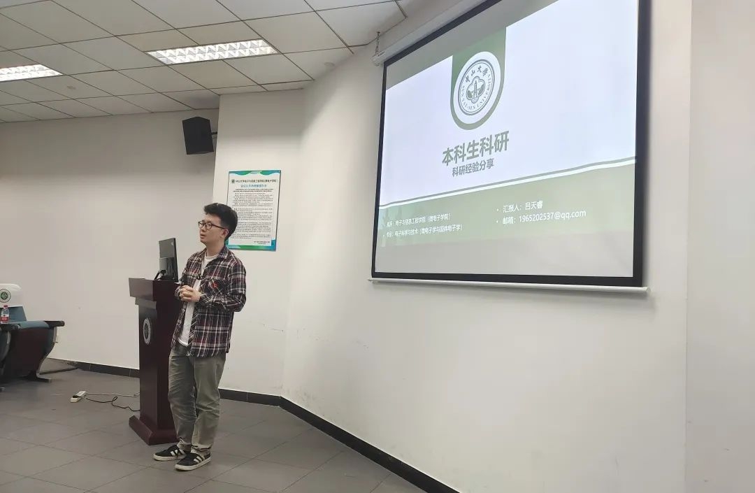 接下来是吕天睿同志的分享。吕天睿同志是电子科学与技术专业的研究生,本科期间多次获得校优秀学生奖学金,曾获得美赛H奖、集创赛国家一等奖等奖项。吕天睿同志细致全面地分享了自己在2020年主持大学生创新项目,并最终入选国家大创年会的经历。吕天睿同志从科研技能的扩展入手,厘清同学们对科研的基本认识,强调要坚持学习新的知识,加强信息检索、文献阅读等能力。进而还现身说法,从大学生创新创业项目申请书的撰写、项目的持续有效开展、成果的总结整理及项目的持续性研究等方面进行了具体的讲解,为本科生同学生动形象地展示了自己“做芯片”的流程。最后,吕天睿同志对不同发展目标的本科生给出了定制化的建议,强调了本科生参与科研能够获得的优势。