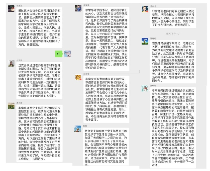 2020年初新冠肺炎疫情暴发,许多同学未能返校只能居家学习,特别是对于博士研究生,很可能由于耽搁了科研工作时间而使得实验任务无法及时完成,进而导致心理上焦虑和不安情绪产生。为更好地缓解同学们的焦虑情绪,2020年5月29日,由学院党委牵头,教职工第一党支部联合博士第一党支部通过线上方式联合开展了“师生暖心连线,传道授业解惑”主题党日活动。