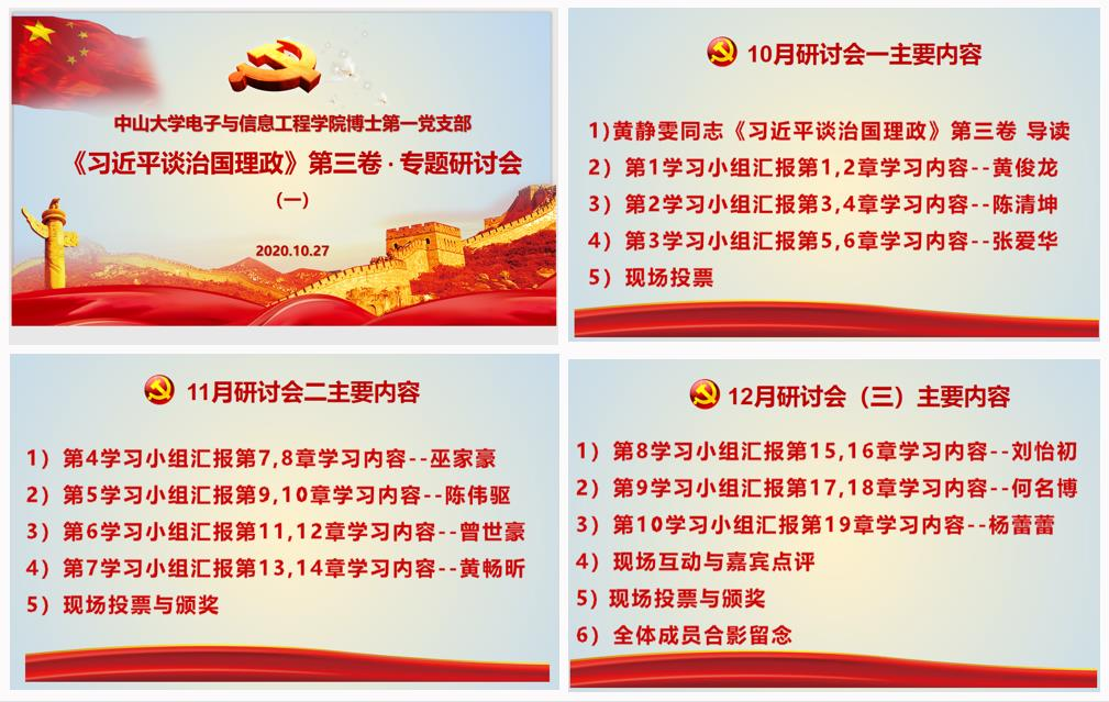 为深刻理解《习近平谈治国理政》第三卷出版发行的重大意义,根据学校、学院党委关于该书学习宣传教育培训的工作方案部署,支部组织30名博士生党员以个人自学、小组学习和集中学习讨论的形式,在2020年10月、11月、12月三次主题党日活动中开展《习近平谈治国理政》第三卷专题读书交流研讨会。同时为促进学习效果,支部增设评选活动,通过线上投票及互动答题加分,最后选出4组优秀研讨小组获得此次活动优秀学员荣誉。