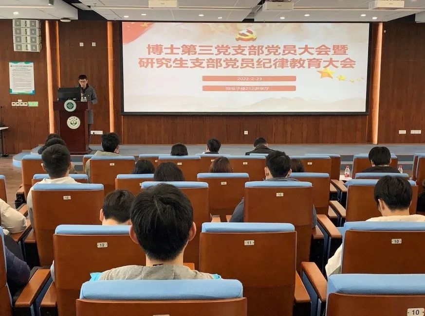 为深入推动学院全面从严治党工作,加强学院廉洁文化建设,强化研究生党员纪律意识,营造优良学风,2022年2月23日,威廉希尔中文网站平台结合博士第三党支部党员大会,召开全体研究生支部党员纪律教育大会,并特别邀请到学校纪委监督检查室主任、监察处副处长彭懿为研究生党员作主题为“学党史悟思想,守纪律讲廉洁”的专题辅导课。学院党委书记刘飞、副书记王琅、研究生秘书陈淑芬、党务秘书李佳玲,学校纪委赵静老师,以及学院各学生支部纪检委员、研究生支部全体党员等约200人共同参会学习活动,会议由博士第三党支部书记孔嘉权主持。