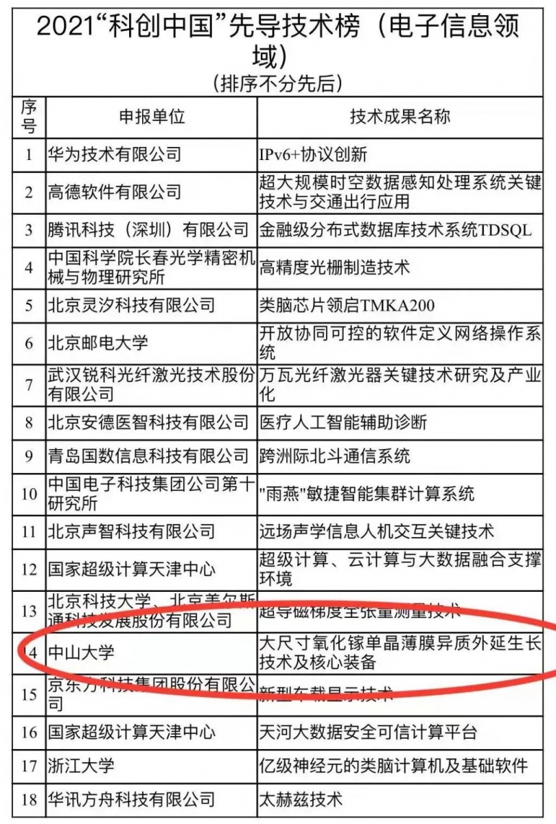 为深入贯彻习近平总书记在两院院士大会、中国科协第十次全国代表大会上的重要讲话精神,推进“科创中国”试点城市(园区)政产学研金服用深度融合,完善国家创新体系,加快建设科技强国,实现高水平科技自立自强,中国科协组织开展2021“科创中国”榜单征集遴选工作。经过初评、终评,遴选结果于2022年2月8日公示。中山大学威廉希尔中文网站平台王钢教授研发团队十多年自主研发的“大尺寸氧化镓单晶薄膜异质外延生长技术及核心装备” 入选中国科协2021年“科创中国”先导技术榜,这是广东省高校本次唯一入选的项目。