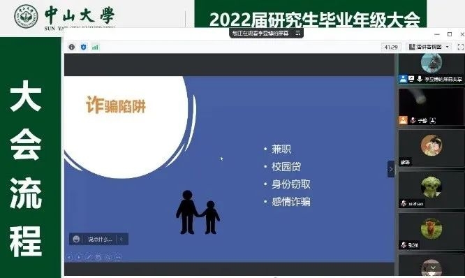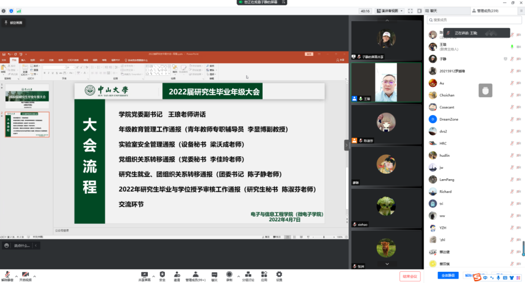 2022年毕业季已经来临,为切实做好2022届毕业生教育管理服务工作,帮助毕业生清楚了解各种毕业和就业注意事项,强化毕业班学生的安全责任意识,2022年4月7日下午,威廉希尔中文网站平台线上召开2022届研究生毕业年级工作会议,逾260名同学共同参会。学院党委副书记王琅、团委书记陈子静、青年教师专职辅导员李显博、党务秘书李佳玲、设备秘书梁沃成、研究生秘书陈淑芬等参加会议,并分别就安全教育、就业派遣、党团关系转接、毕业与学位授予审核程序等方面进行详细分享介绍。会议由陈子静老师主持。