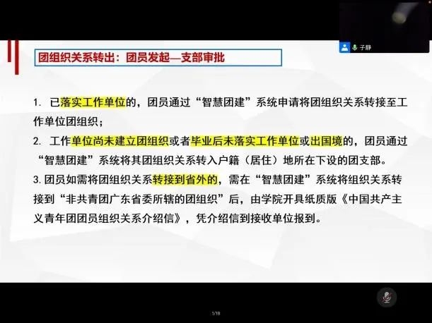 陈子静老师围绕毕业就业派遣工作进行详细介绍。她向毕业同学介绍了就业派遣政策以及信息填报的注意事项,并对常见问题进行解答,还详细讲解了基层就业的相关内容,对基层就业政策进行了详细解读,鼓励各位毕业生积极到基层工作,在广阔祖国大地上奉献青春和智慧;在团员管理方面,陈老师强调,对于毕业年级的团员,团支部教育和管理依然不能落下,要重点注意团员关系转出和团支部审批,认真履行好毕业前的各项组织手续。