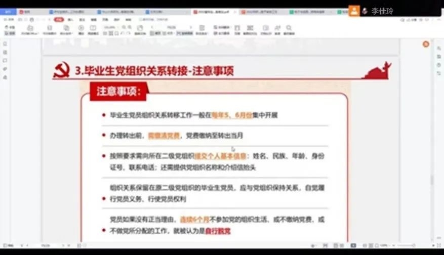 李佳玲老师针对党组织关系转移中的注意事项为大家进行了讲解。她强调作为毕业生党员,要特别重视自己的党组织关系转接问题,按照规定与流程进行操作,珍惜自己的党员身份。党员有问题和需求应第一时间联系所在党支部,如有特殊问题或困难,也应第一时间上报学院协调解决。