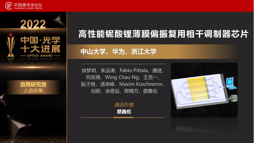 2022年度中国光学十大进展发布,中山大学蔡鑫伦教授团队研究成果“世界首例铌酸锂薄膜偏振复用相干光调制器”成功入选“2022中国光学十大进展”(应用研究类),这是该团队继2019年和2020年后第三次获此殊荣。获奖研究成果于2022年1月以“Dual-polarization Thin-film Lithium Niobate IQ modulator for Terabit-per-second Transmission”为题发表在光学顶尖国际期刊Optica上。该项研究成功研制出了在下一代超高速、低功耗的相干光传输系统不可或缺的电光转换器件。博士研究生徐梦玥和博士后朱运涛为该论文的共同第一作者。