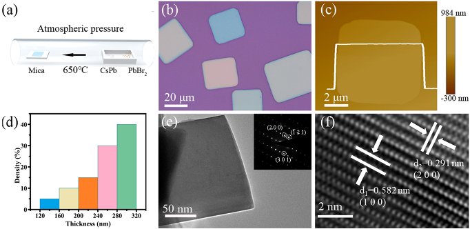 研究人员首先采用实验室所发展的APCVD方法成功在云母衬底上制备出高密度的单晶CsPbBr3微米方片,如图1所示,这些单晶材料具有均匀的矩形形貌,其平面尺寸分布在30 μm~60 μm,均方根表面粗糙度低于1.47 nm,平均厚度约为204 nm。而原子分辨的透射电子显微镜(Transmission electron microscopeTEM)图和明锐清晰的电子衍射图案(图1e-f)则表明APCVD法所制备的微米片为结晶性良好的单斜CsPbBr3相。