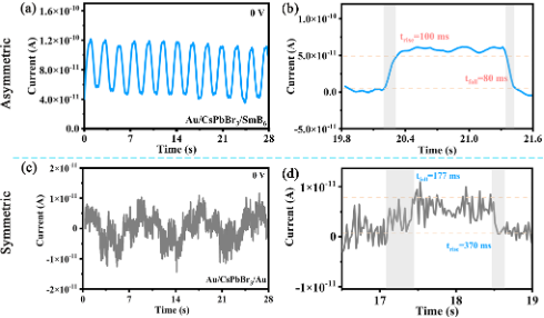 3. 非对称电极型Au/CsPbBr3/SmB6器件和对称电极型Au/CsPbBr3/Au器件在零偏压下的时间响应曲线