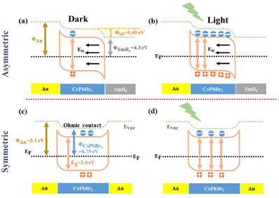 4. 非对称电极型Au/CsPbBr3/SmB6器件和对称电极型Au/CsPbBr3/Au器件在明暗条件的能带图