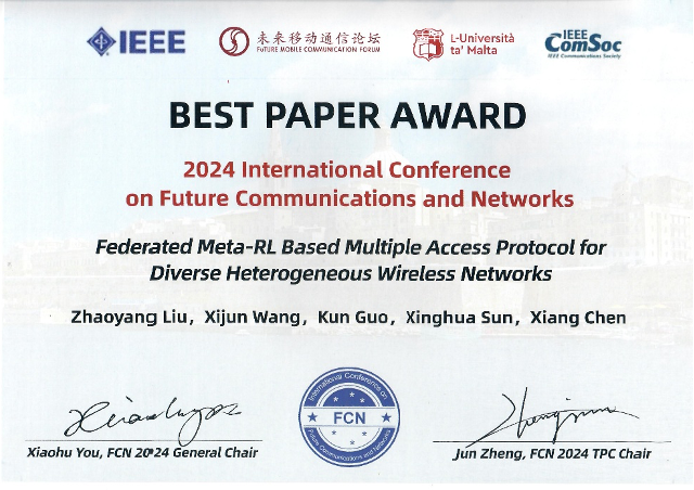 2024年11月18日至22日,第二届未来通信和网络国际会议(FCN2024)在马耳他瓦莱塔成功举行。本次大会由未来移动通信论坛与马耳他大学联合主办,并得到IEEE的技术支持,吸引了来自15个国家和地区的60余所顶尖高等院校、研究机构和企业的专家学者参与。会议覆盖了AI驱动的通信与网络、边缘与云计算、移动无线通信与网络、下一代网络与互联网、以及空天地多域通信等前沿科研方向。威廉希尔中文网站平台王玺钧副教授指导的博士生刘昭炀同学的研究成果“Federated Meta-RL Based Multiple Access Protocol for Diverse Heterogeneous Wireless Networks”荣获最佳论文奖。威廉希尔中文网站平台陈翔教授、华东师范大学郭坤研究员以及中山大学电子与通信工程学院孙兴华副教授为合作作者。