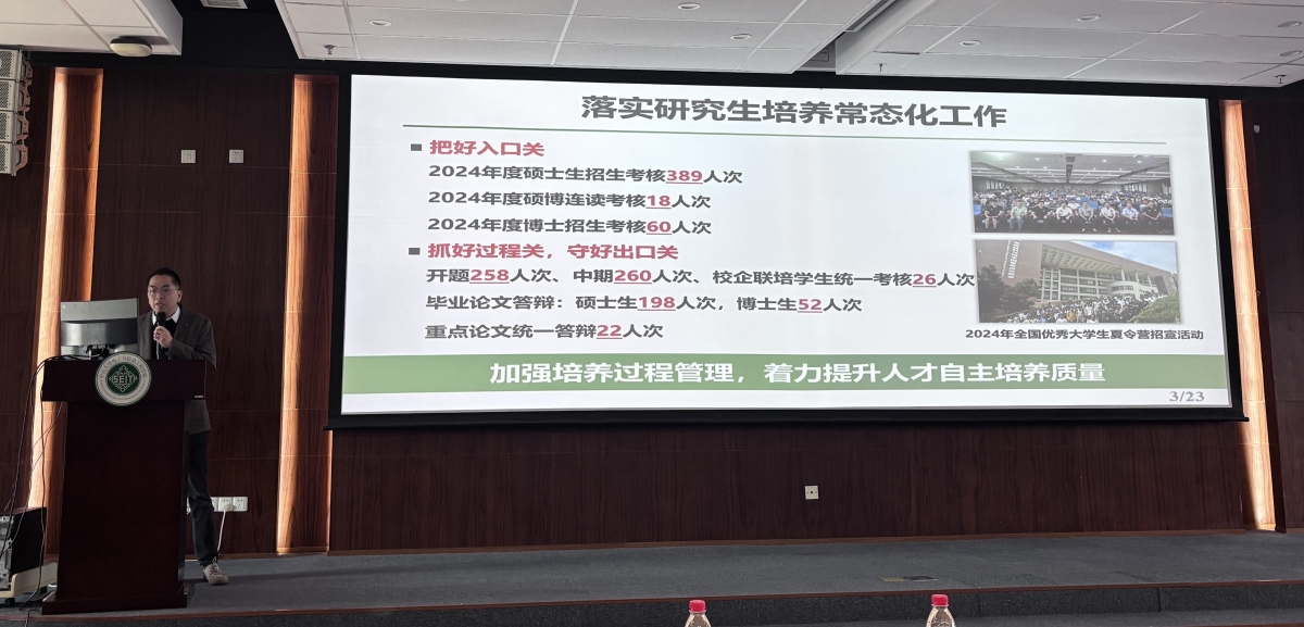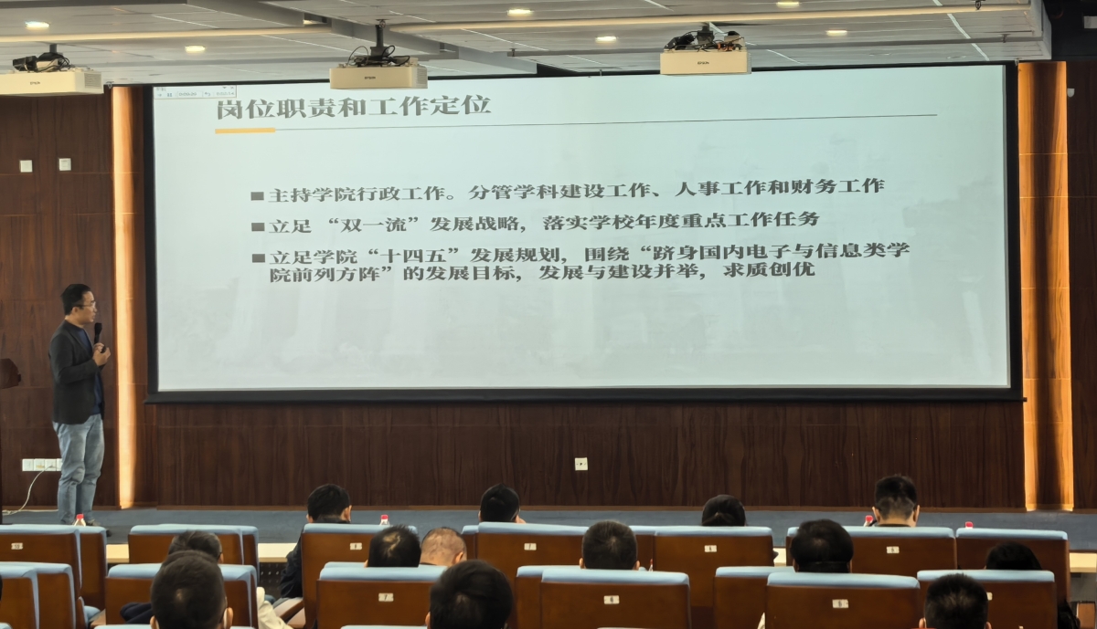 佘峻聪院长围绕学院整体工作进行述职。学院立足“十四五”发展规划和“双一流”发展战略,围绕“跻身国内电子与信息类学院前列方阵”的发展目标,发展与建设并举,求质创优,在行政工作、学科建设、人才培养、师资队伍建设、科学研究、国际合作、校友工作等方面取得了较好的成绩。佘峻聪院长指出,2025年学院将继续坚持党建引领,坚持立德树人根本任务,围绕学校和学院的“十四五”规划(收官之年)、一流学科建设、国家级和省部级科研、教学平台创优等核心任务,持续推进高质量人才培养(本科生创新班、研究生优秀生源率)、高水平师资队伍建设(海优引进和国家级人才引育)、高影响力科研成果产出(国家级和省级奖项)、服务国家重大战略(重大重点项目)和服务产业(校企联合实验室)能力提升等重点工作,提前谋划“十五五”规划,服务师生(办学场地调整)、推进学院事业高质量内涵式发展。