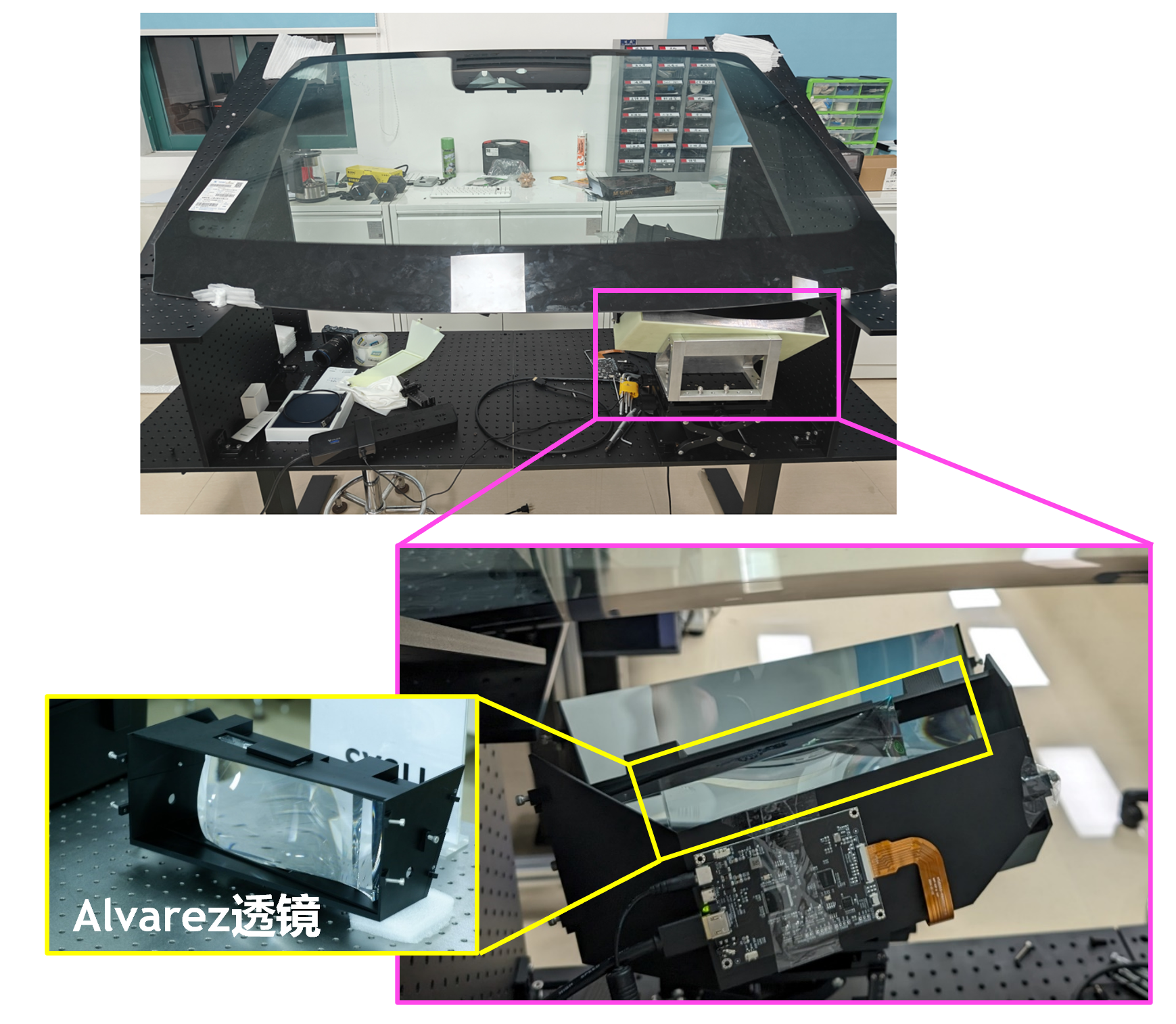 针对以上问题,课题组基于自由曲面横向滑动变焦的Alvarez透镜引入HUD,发挥自由曲面光学在器件尺寸上的优势,解决了三次相位自由曲面在大离轴光路中的面型优化、反射-透射自由曲面联合设计等难题,实现了超大口径平面变焦器件及基于此的变焦AR-HUD样机(图2)。