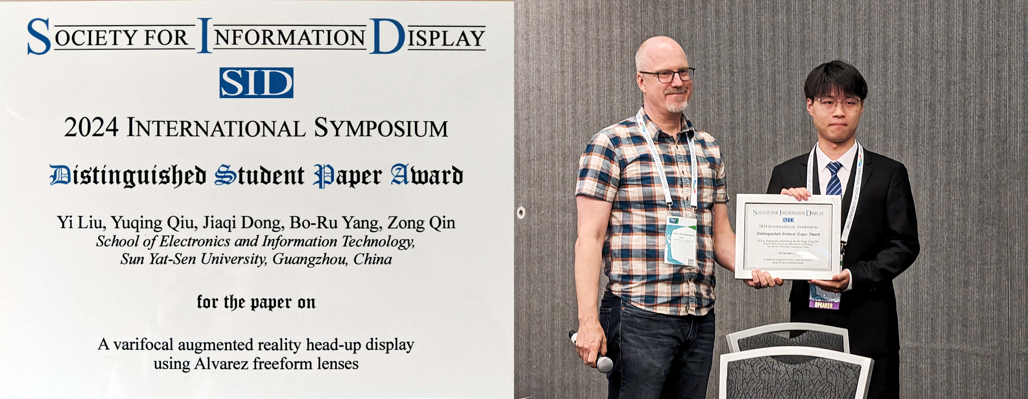 该项目主要参与人员还包括刘一同学(威廉希尔中文网站平台2018级光电本科,2022级电子科学与技术硕博连读)和董家麒同学(威廉希尔中文网站平台2017级光电本科,2021级集成电路工程硕士)。并且,该项目的研究成果于2024年以论文《Varifocal augmented reality head-up display using Alvarez freeform lenses》在美国圣何塞举办的显示领域顶会SID Display Week获得Distinguished Student Paper Award,刘一同学为第一作者。该奖项获奖率低于5%,获奖人来自斯坦福大学、中佛罗里达大学、Google、Meta、索尼、京东方等一流单位。